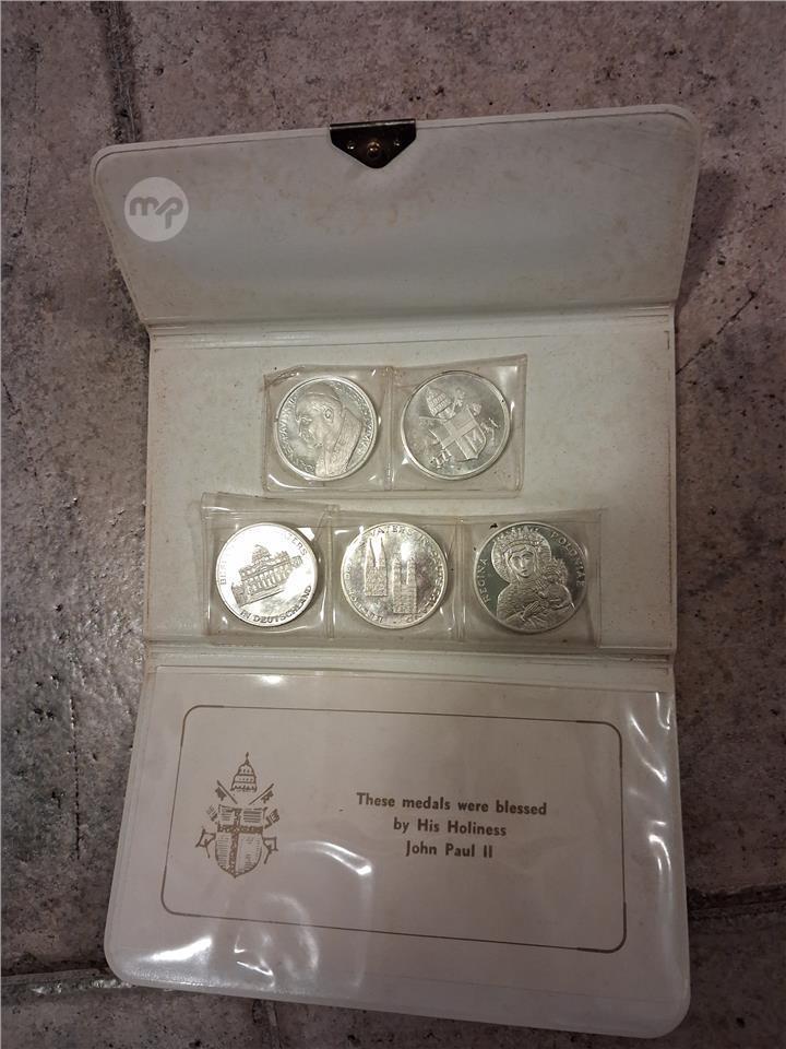 A collection of Silver Medals of Pope John Paul II blessed by the Pope himself. All 5 medals are in a special pocket with fastener.