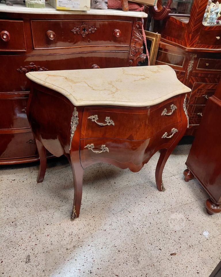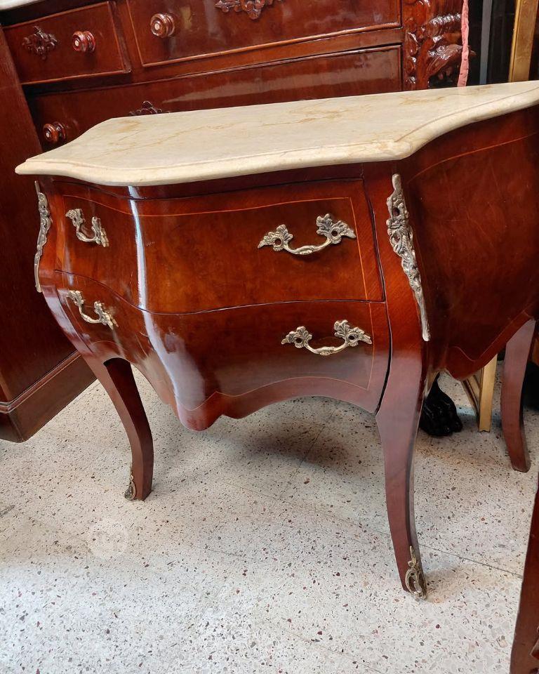 Two Louis XV-style mahogany and burlwood chest of drawers with a serpentine mar
