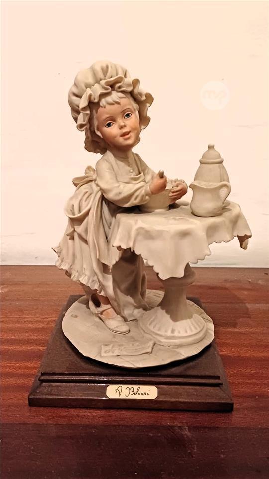 A. Belcari Italian Figurine, Girl at Table, Wood Base, Vintage Collectible