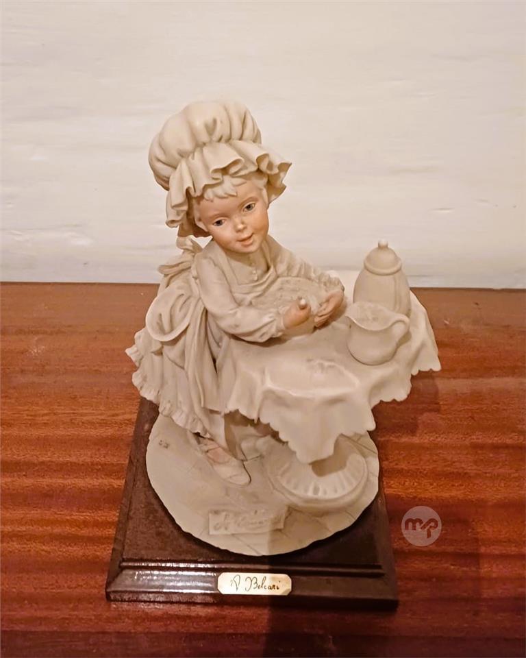 Charming vintage figurine by Italian artist Auro Belcari captures a nostalgic, heartwarming scene of childhood innocence. Crafted with the meticulous detail characteristic of the Dear Sculpture studio, this piece is an excellent find for collectors. Subject is a young girl in Victorian-style attire (bonnet and apron) playfully preparing food or tea at a small table. Made from high-quality resin/composition with a matte bisque finish, mounted on a solid wooden plinth.