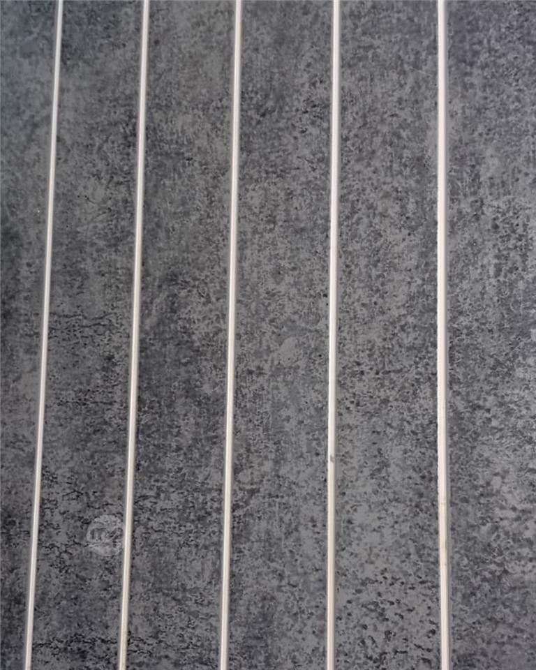 Striking polished porcelain tile in deep charcoal grey with authentic concrete texture and bold vertical metallic silver ribs for a striking industrial-modern contrast. Matte base with glossy ribs adds premium depth and light play – perfect for dramatic feature walls, contemporary kitchens, bathrooms, or urban loft vibes.