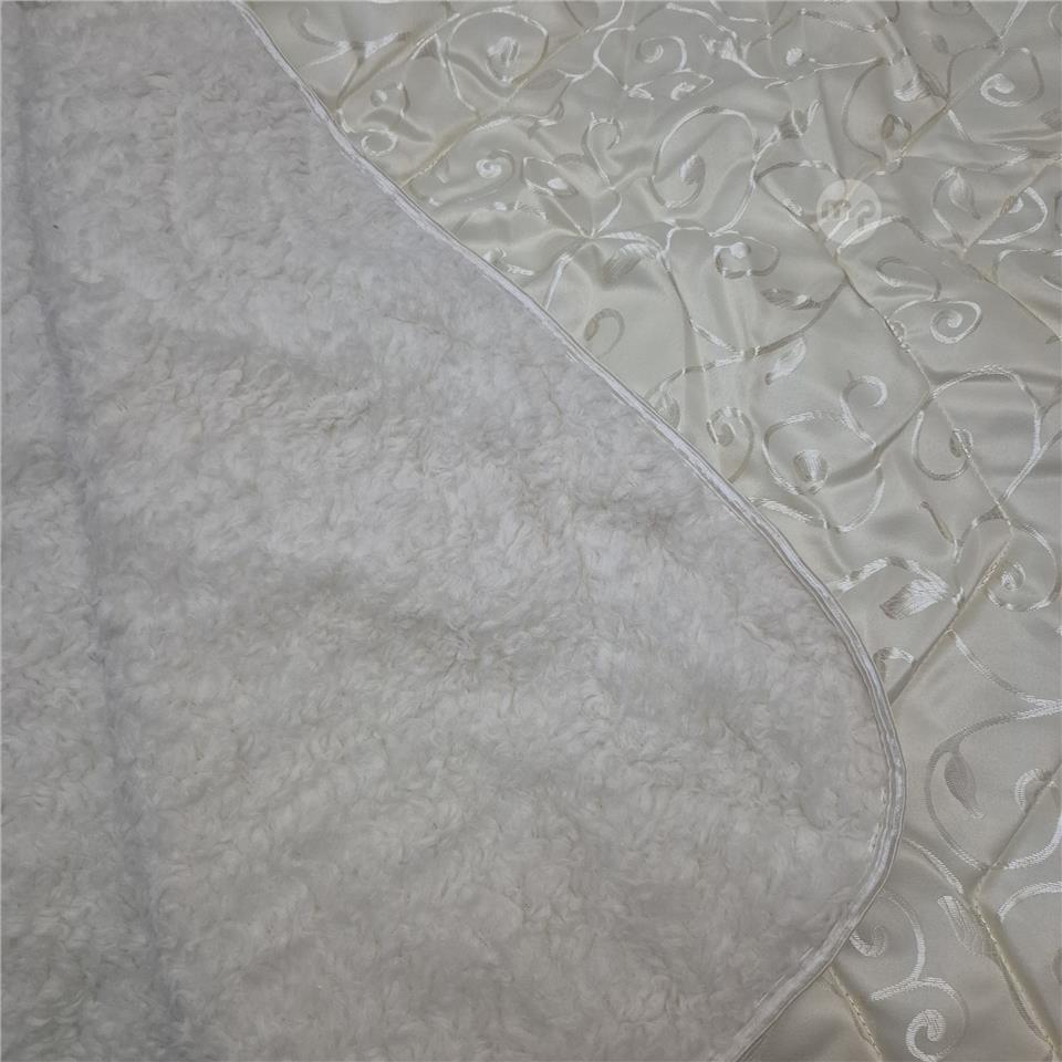 Luxurious king-size reversible blanket or duvet in an elegant Ivory colour. One side features a smooth satin-finish fabric with a subtle quilted swirl pattern, while the reverse side is ultra-soft sherpa/faux sheepskin fleece for maximum warmth and comfort.