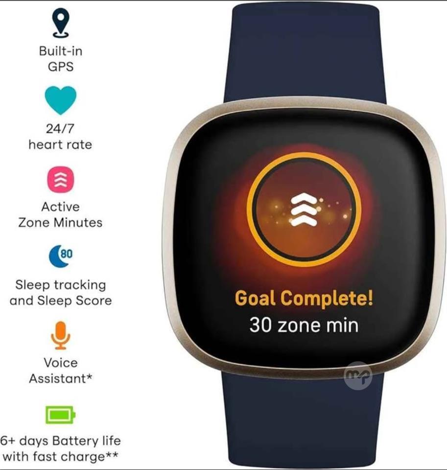 Fitbit Versa 3 Health & Fitness Smartwatch with GPS, 24/7 Heart Rate, Alexa Built-in, 6+ Days Battery, Midnight Blue/Gold, One Size (Black, White, Grey, pink and gold bands)