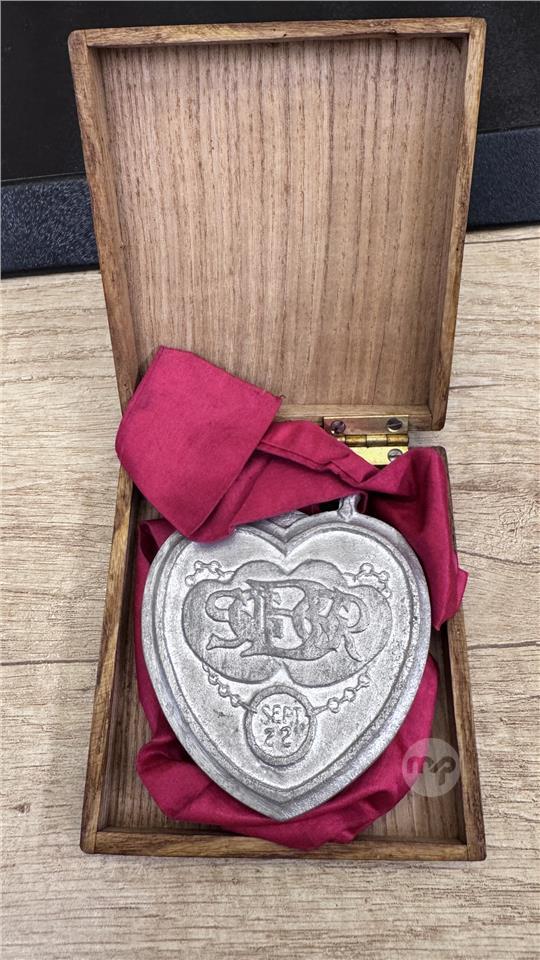 This appears to be a vintage or antique commemorative medal, likely made of pewter, presented in a small wooden box.