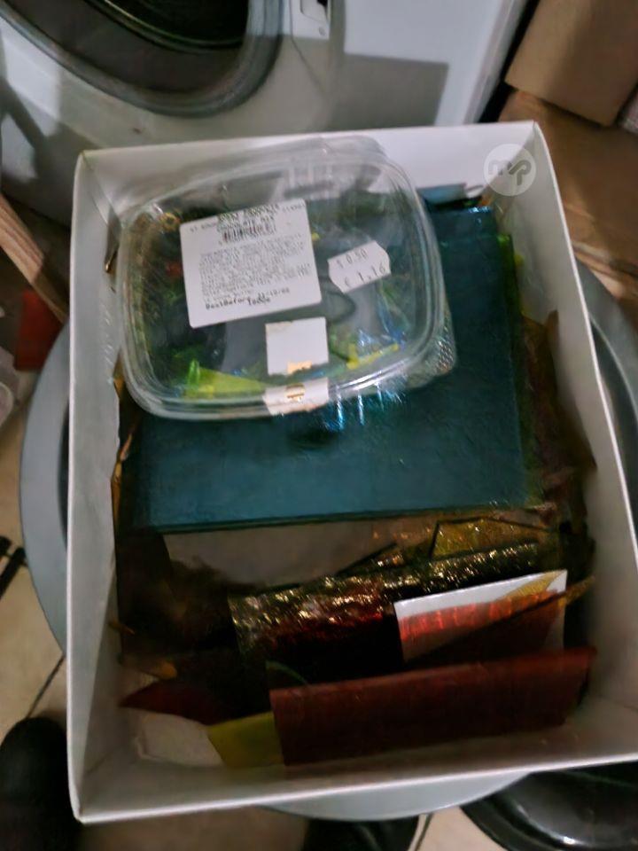 Box full of stained glass of different colours.