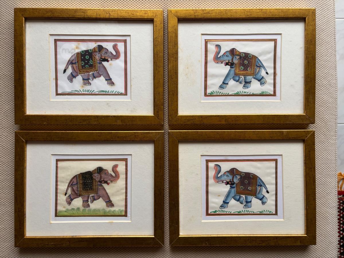 Set of 4 Indian elephants motive hand painted on silk in golden frames 22 cm x 15 cm