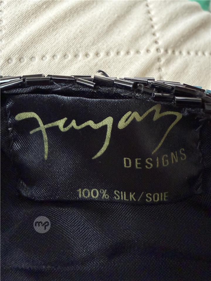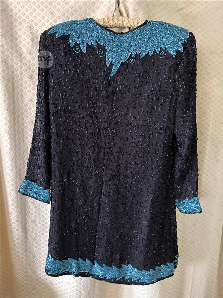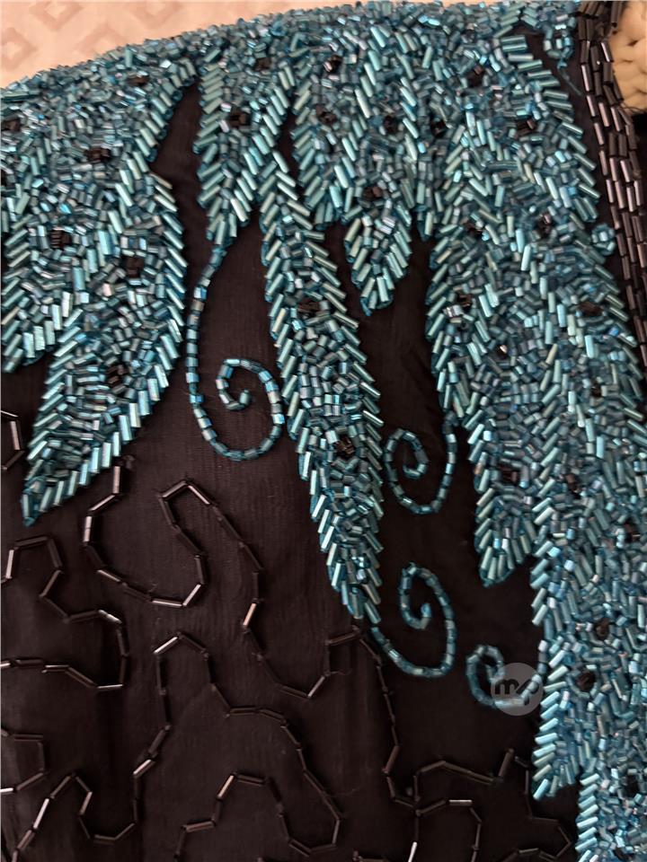 Classic evening beaded gown. Black with turquoise border. Handmade. 100% silk. Condition: As new.