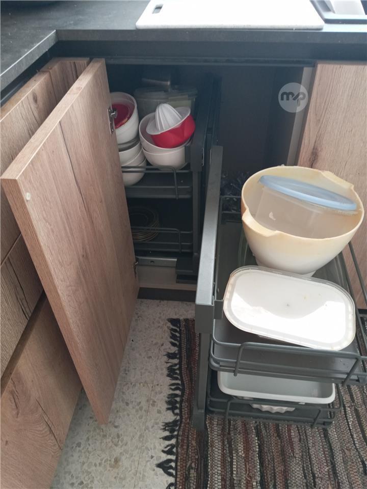 With expensive corner cupboard draw-out and slide-in shelving mechanism.