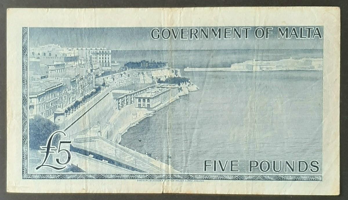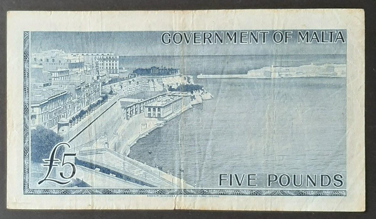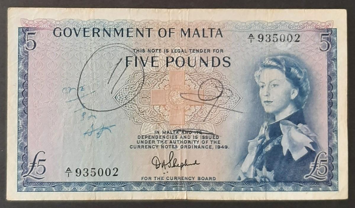 MALTA - GOVERNMENT OF MALTA ELIZABETH II FIVE POUNDS £5 BANKNOTE signed SHEPHERD (VERY SCARCE)