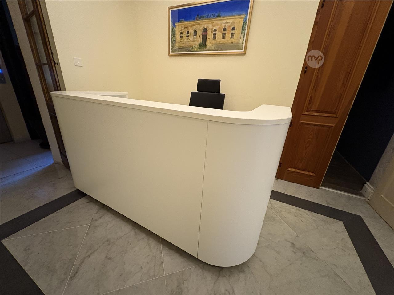 White reception desk in good condition. Clean, modern design with a smooth finish ideal for offices, salons, or clinics. Sturdy, practical, and ready for immediate use. For measurements please see photos. Chair not included.