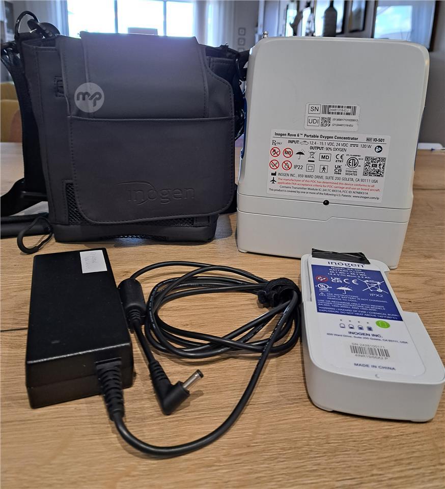 Oxygenator, portable, complete with battery and carry case, charger, transformer and 12V-Adapter.