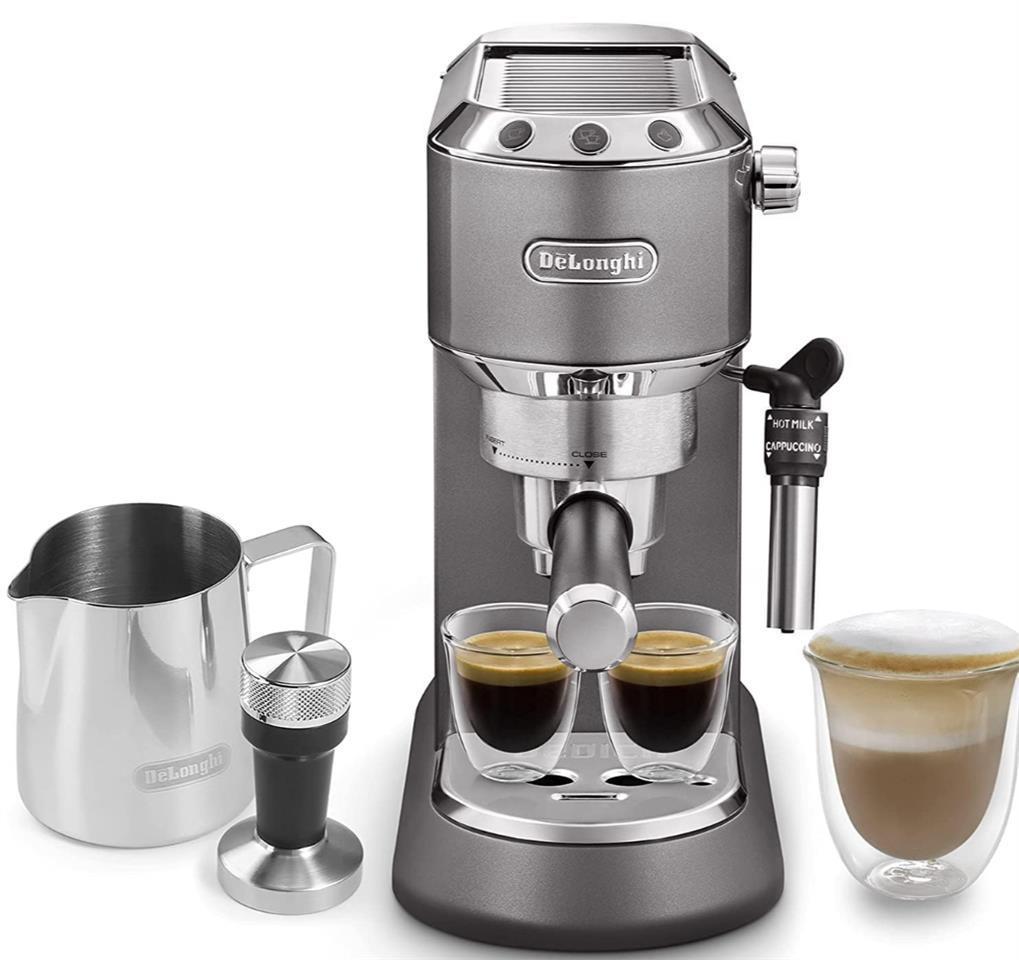 De'Longhi Dedica Metallics Coffee Machine with Milk Frother, Traditional Barista Pump Espresso Machine, Coffee and Cappuccino Maker, EC785.GY, 1300 W, Grey