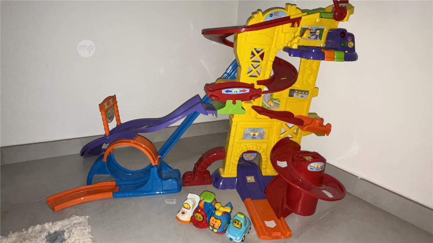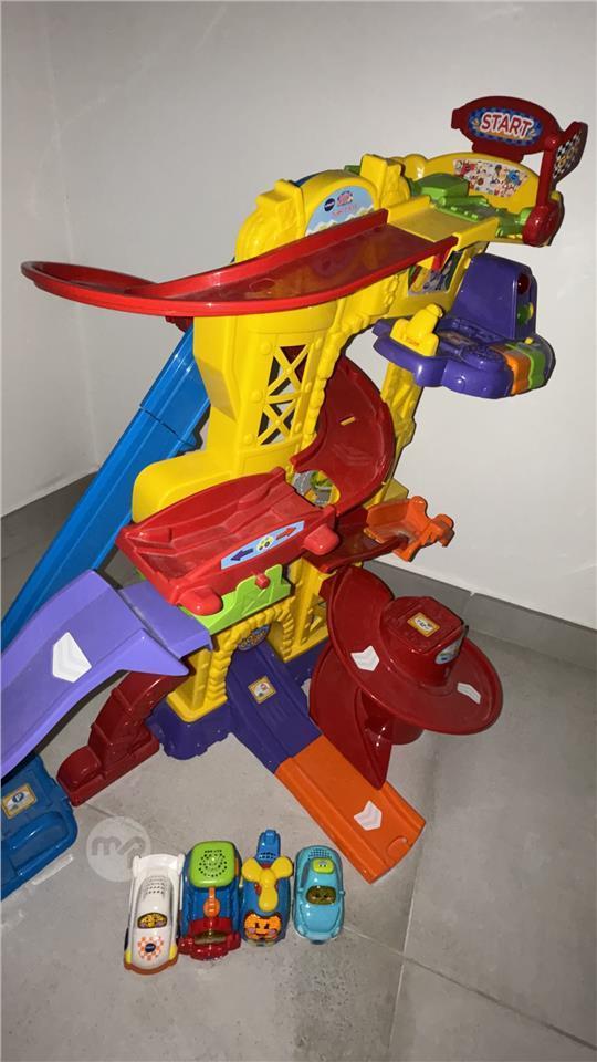 Vtech super track with pit stop including 4 cars. Barely used. Train car in french language.
