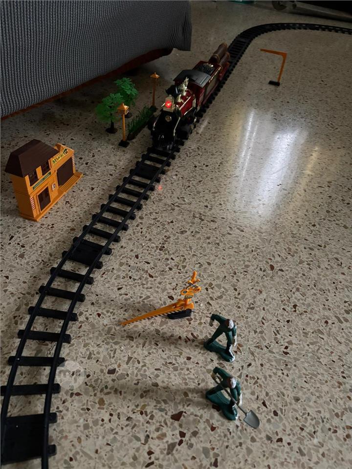 Train for kids that comes with other pieces of toys like trees etc. Works with 6 AA batteries.