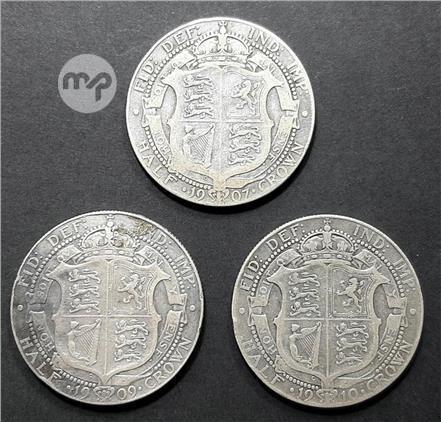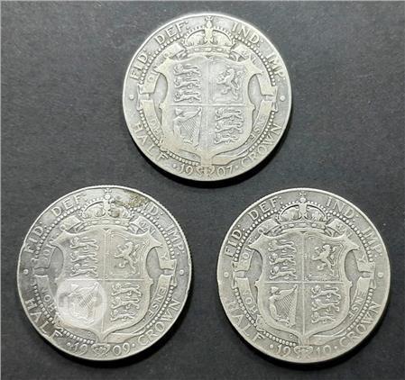 3 KING EDWARD VII STERLING SILVER (.925) HALF CROWN COINS dated 1907, 1909 and 1910
