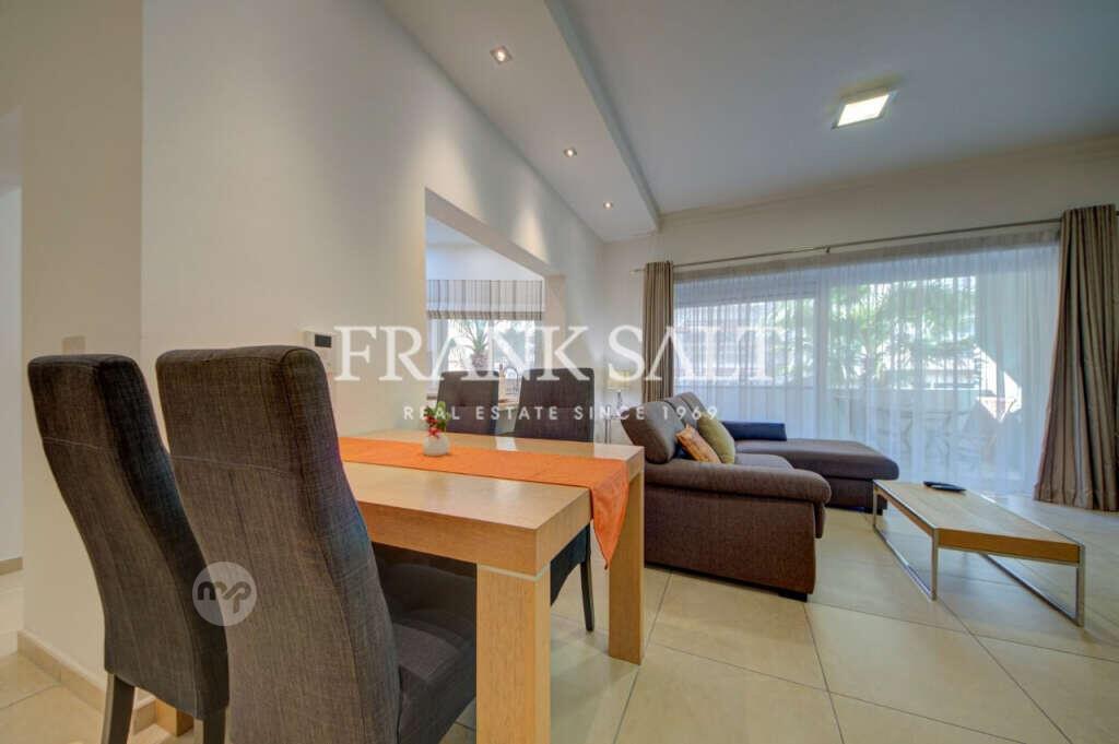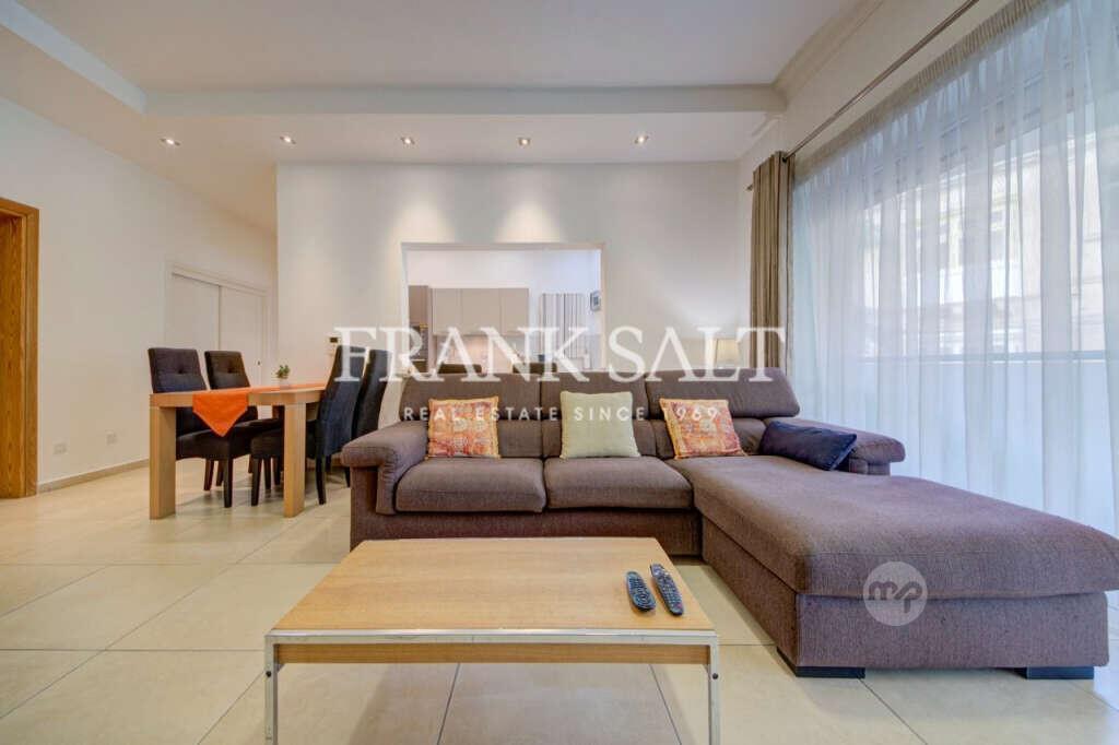 Presenting a well-finished, fully furnished apartment in the heart of Sliema, in the highly sought after Special Designated Area of Fort Cambridge. Situated on the first floor and accessible by 4 lifts, this spacious residence comprises two generously sized bedrooms (main with ensuite), a spare bathroom, and a practical washroom. The open-plan living and dining area leads out to a front balcony with green views at this level. The apartment features a well-equipped kitchen, air conditioning, and excellent finishes throughout. Residents benefit from the use of a communal swimming pool, gym on the premises and a surrounding garden, ideal for relaxation. Additional convenience is provided by an optional private basement garage accommodating two cars. Located inland, the property is close to Malta’s largest shopping mall, Sliema’s shopping district, eateries, bus stops, and well-maintained roads—making daily life easy and enjoyable. Internal area measures 97 sqm with 21 sqm of external space, offering a total area of 118 sqm. Freehold.