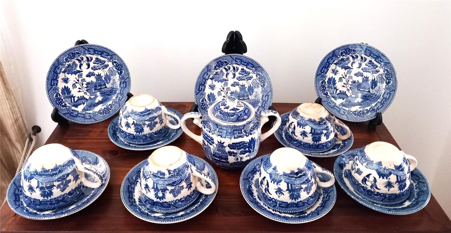 VINTAGE WILLOW PATTERN 6 CUPS, 6 SAUCERS, 3 SIDE PLATES and SUGAR BOWL