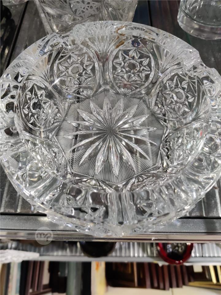 Heavy cut glass ashtray with detailed starburst and geometric pattern.