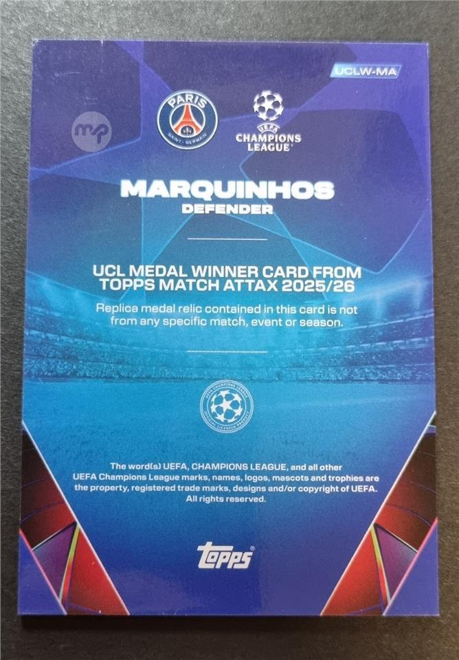 Topps Match Attax 2025/2026 25/26 Marquinhos Ucl Medal Winner Relic Card.