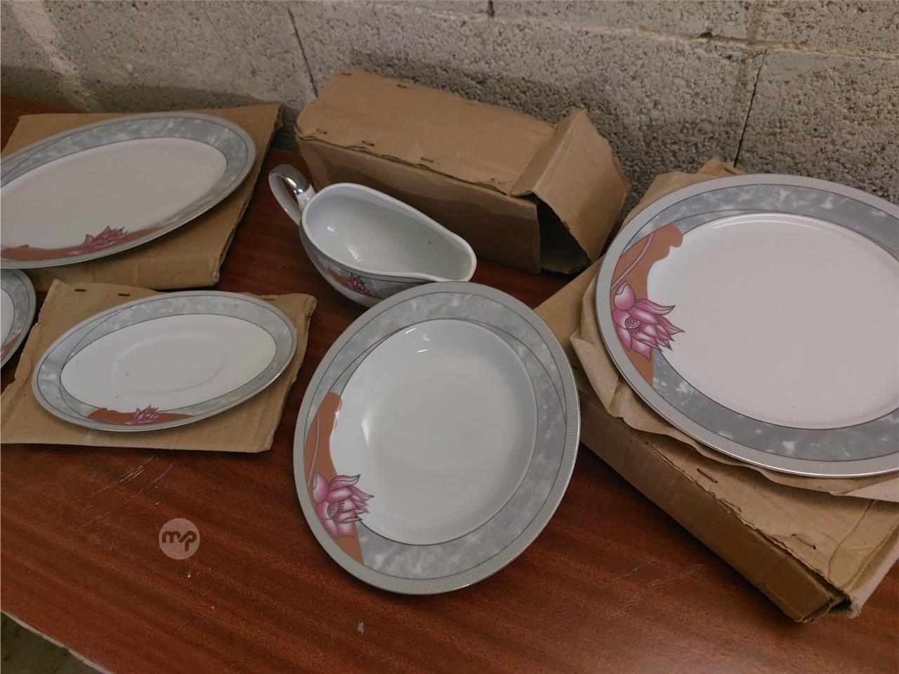 12 normal plates; 1 large plate, 1 tea pot, 11 deep plates, 12 small plates, 1 bowl, 1 large oval plate, 1 small oval plate.