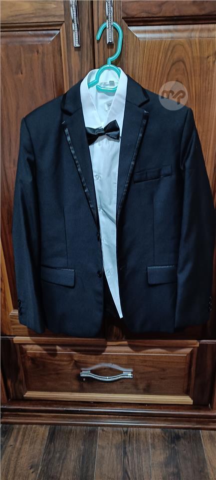 A complete black suit for a 13 to 14 year old. It consists of a black blazer, black trousers, black bow tie and a white shirt.Worn only once.