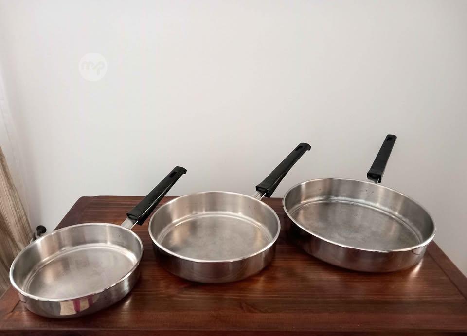 3 STAINLESS STEEL FRYING PANS for €25, 1 POT WITH LID for €19, 1 MANUAL FOOD MILL/GRINDER for €19