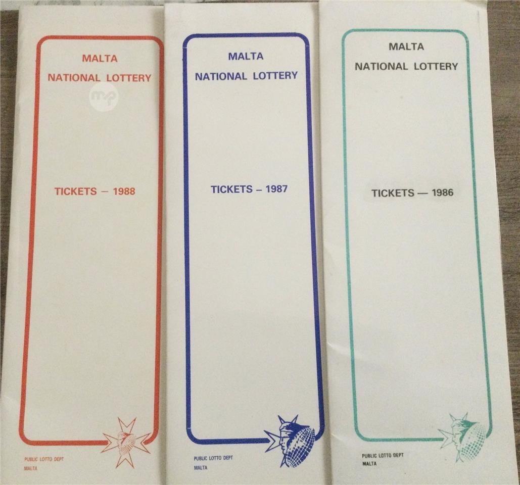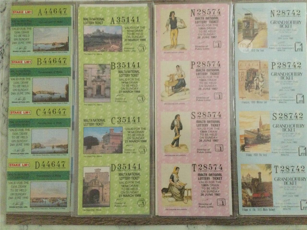 Malta National Lottery Tickets - 1986/7/8 and 1980, in excellent condition (please excuse the photos due to bad lighting.) All folders are available however the 1990 folder has some scribbling on it. Each folder has 16 tickets, not 4 as appears in photos.