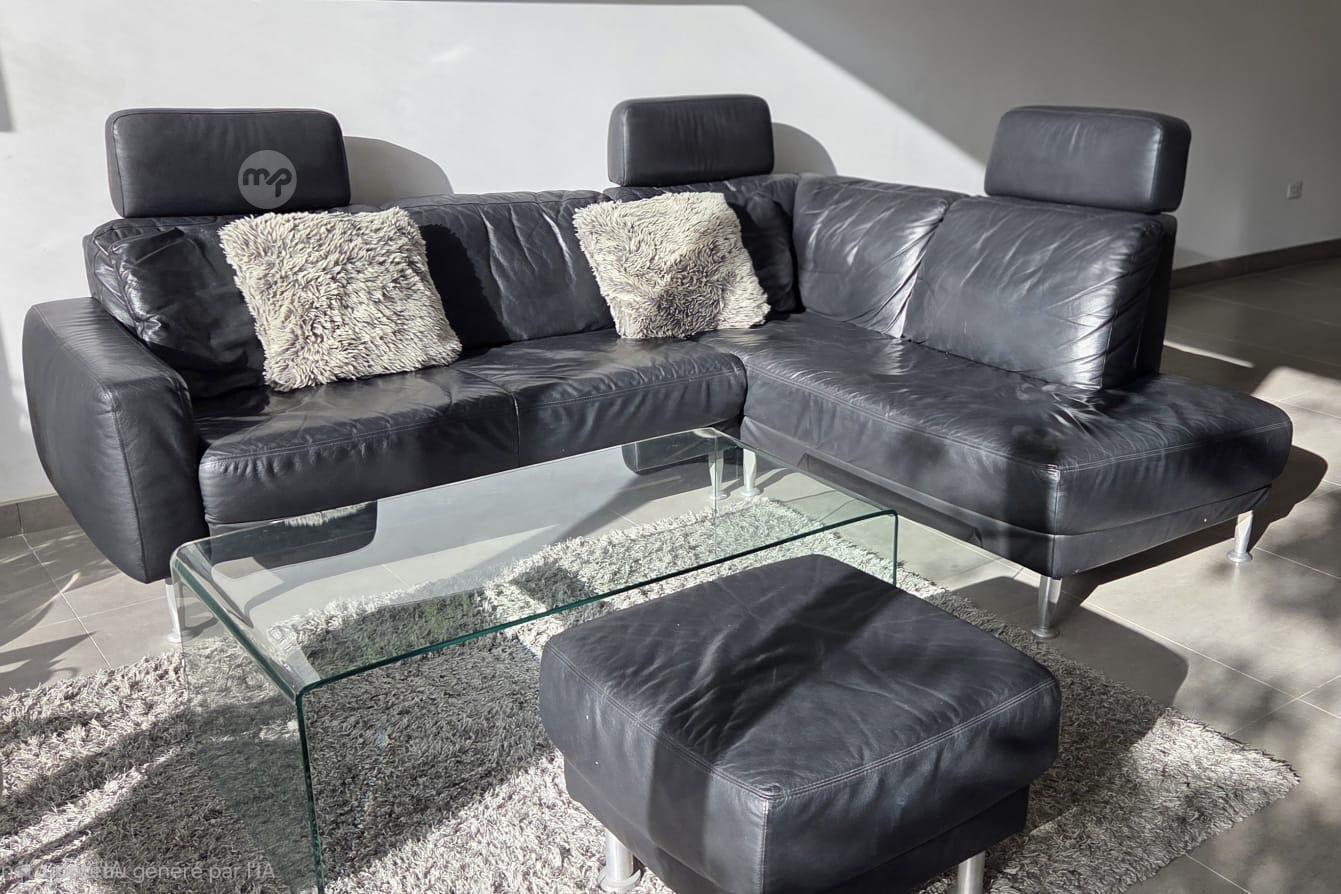 High quality corner black leather sofa (2.3m x 2m). 2 head rests, 2 leather cushions and one extra seat.