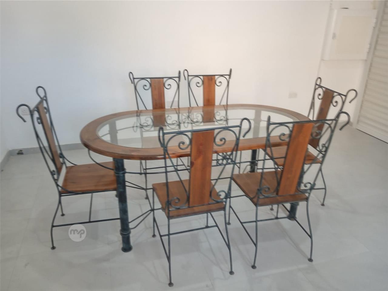 A heavy-duty wrought iron table with a glass top and a wood frame, and complimenting it are 6 chairs too.