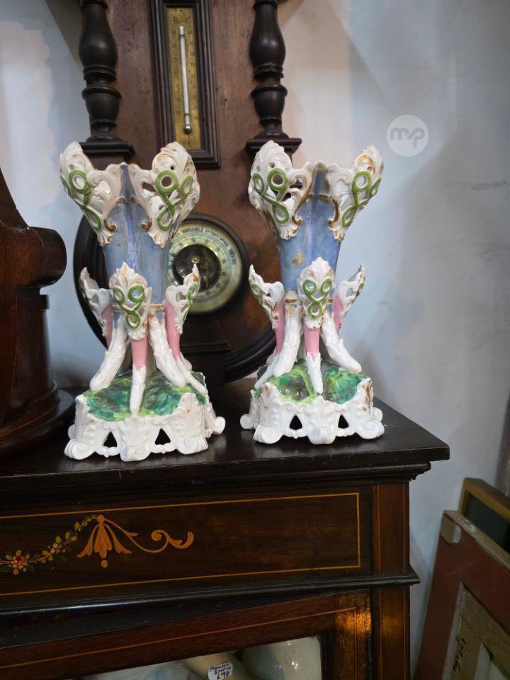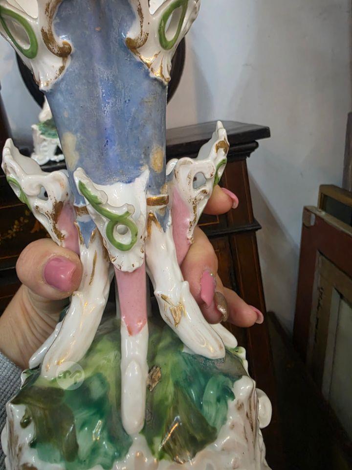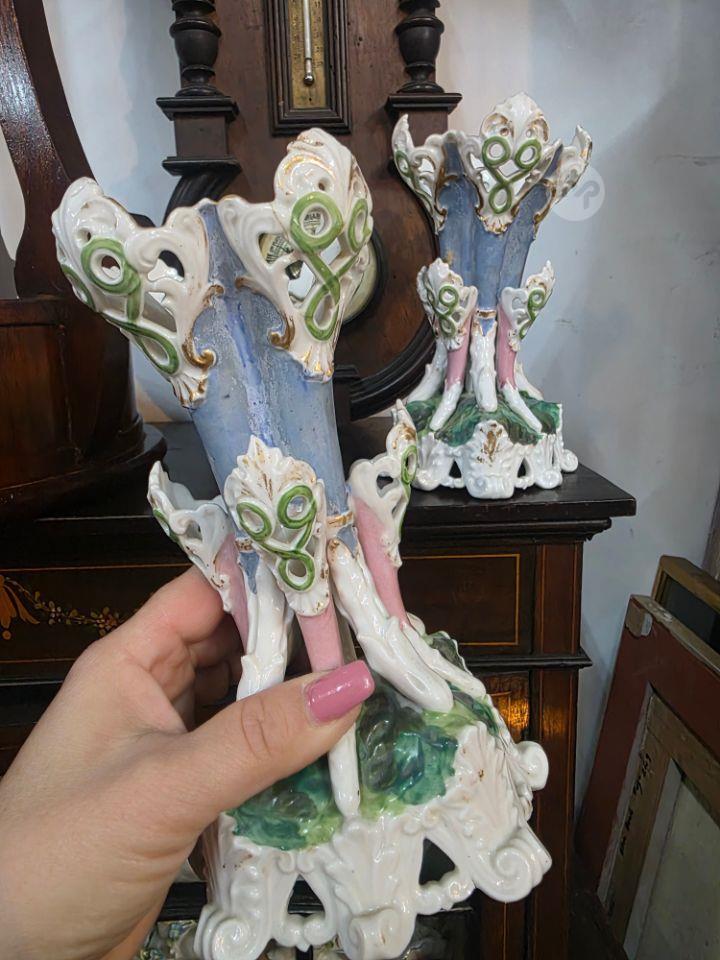 Pair Unusual antique porcelain vases featuring Rococo-style decorations such as