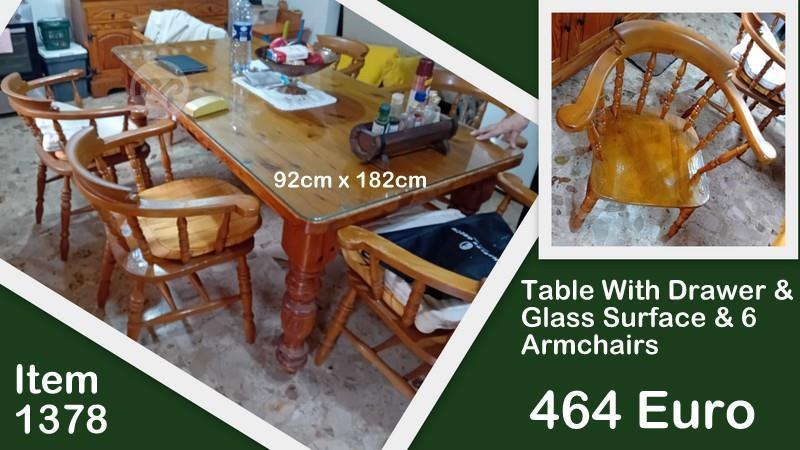 ( 1378 ) SOLID PINE KITCHEN TABLE WITH DRAWER & GLASS SURFACE & 6 ARMCHAIRS