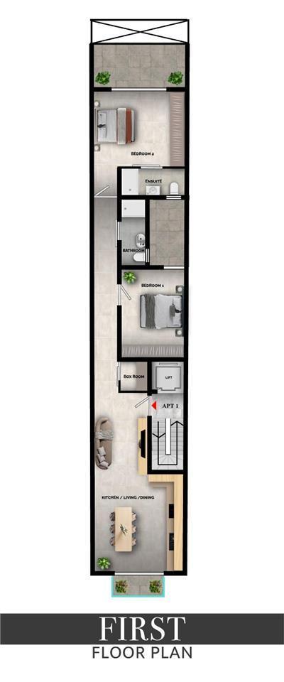 • 1st Floor Apartment – 2 bedrooms, 2 bathrooms (main + ensuite), backyard + internal yard