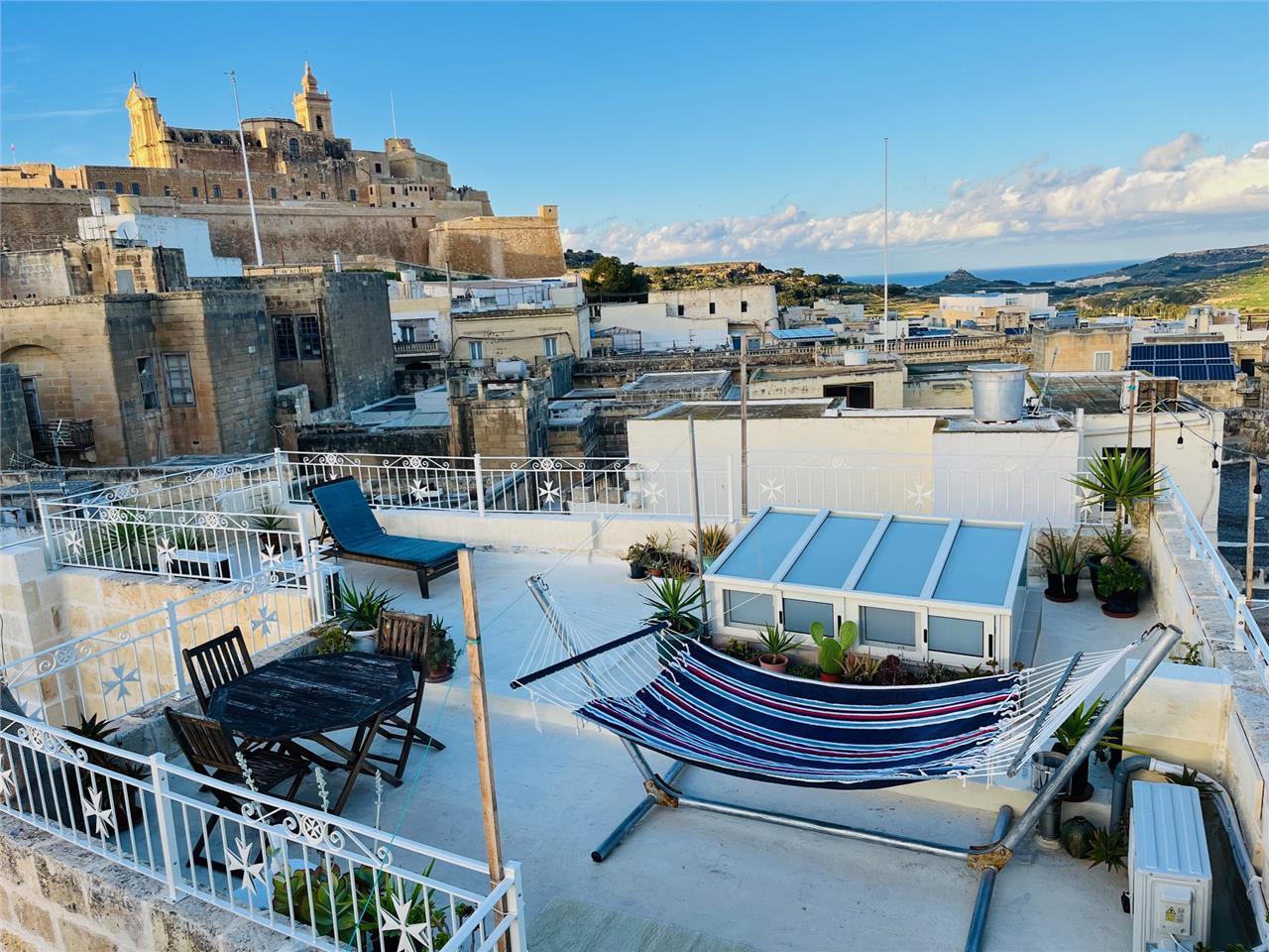 The rooftop terrace enjoys panoramic views of the Cittadella, Marsalforn, Xagħra, Nadur, Xewkija and the Mediterranean, with Sicily visible on clear days.