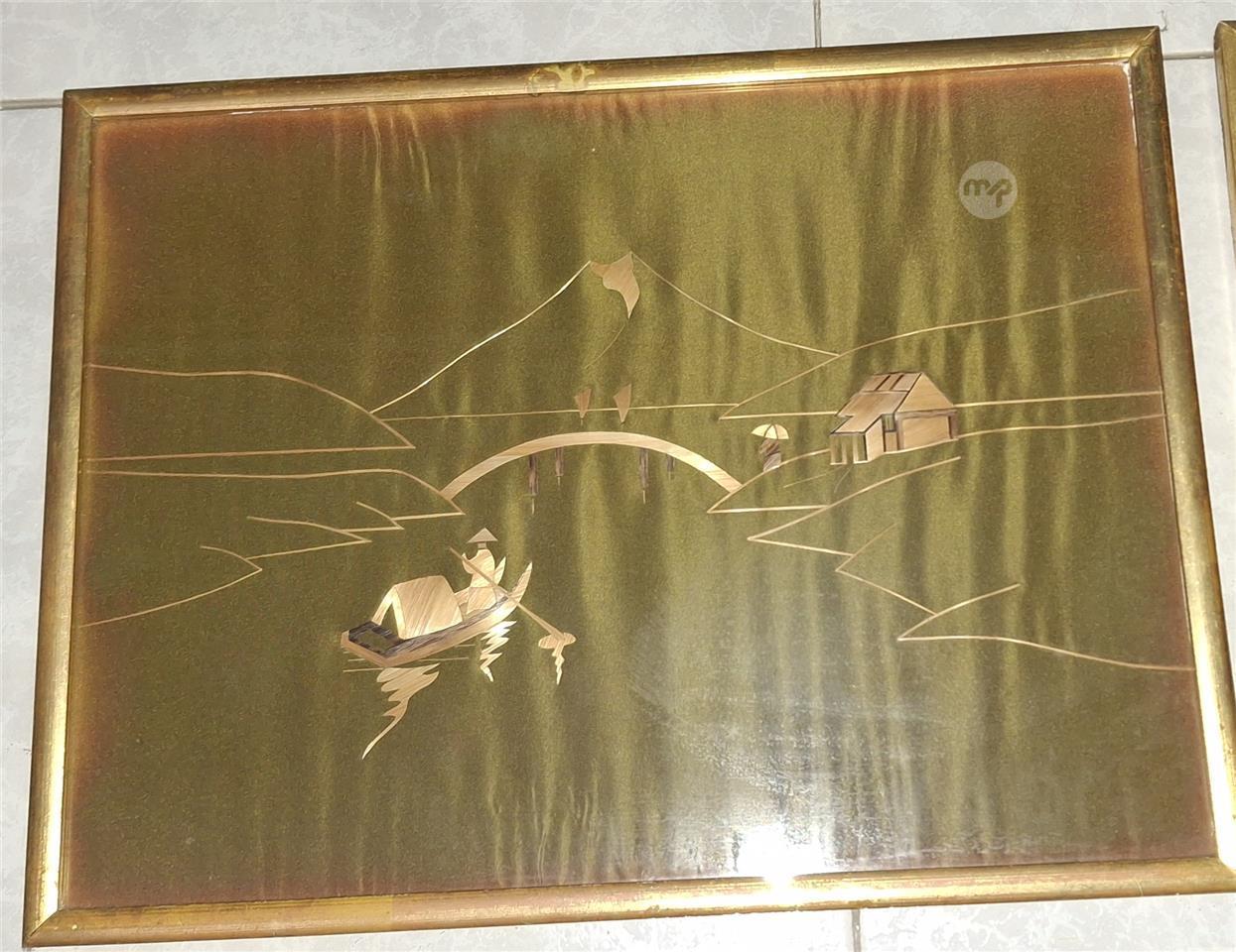 SET OF 4 GOLD FRAMED ANTIQUE PICTURES.SCE ES OF CUT BAMBOO BASED ONGREEN SILK