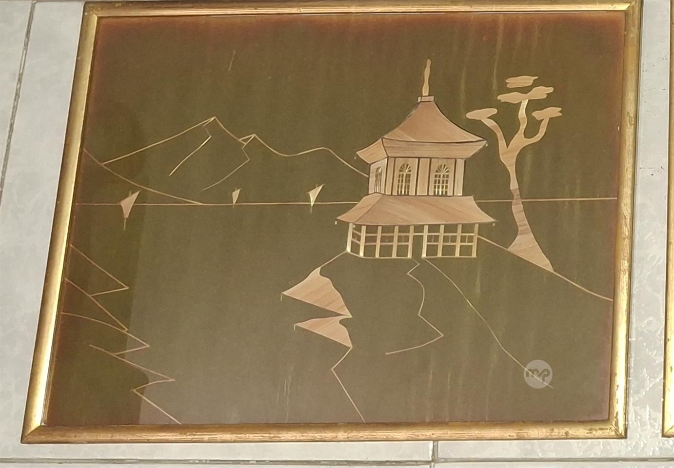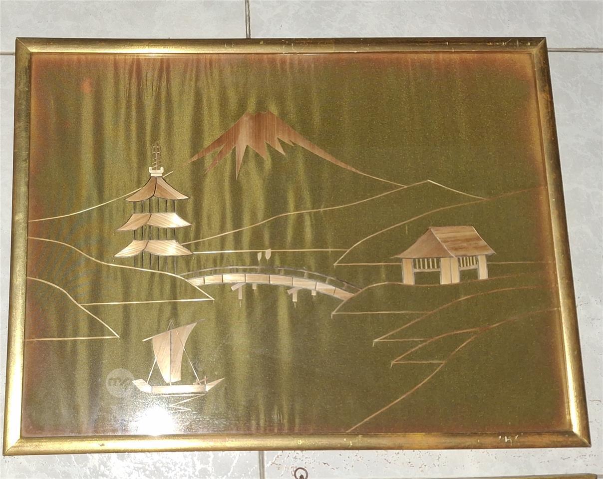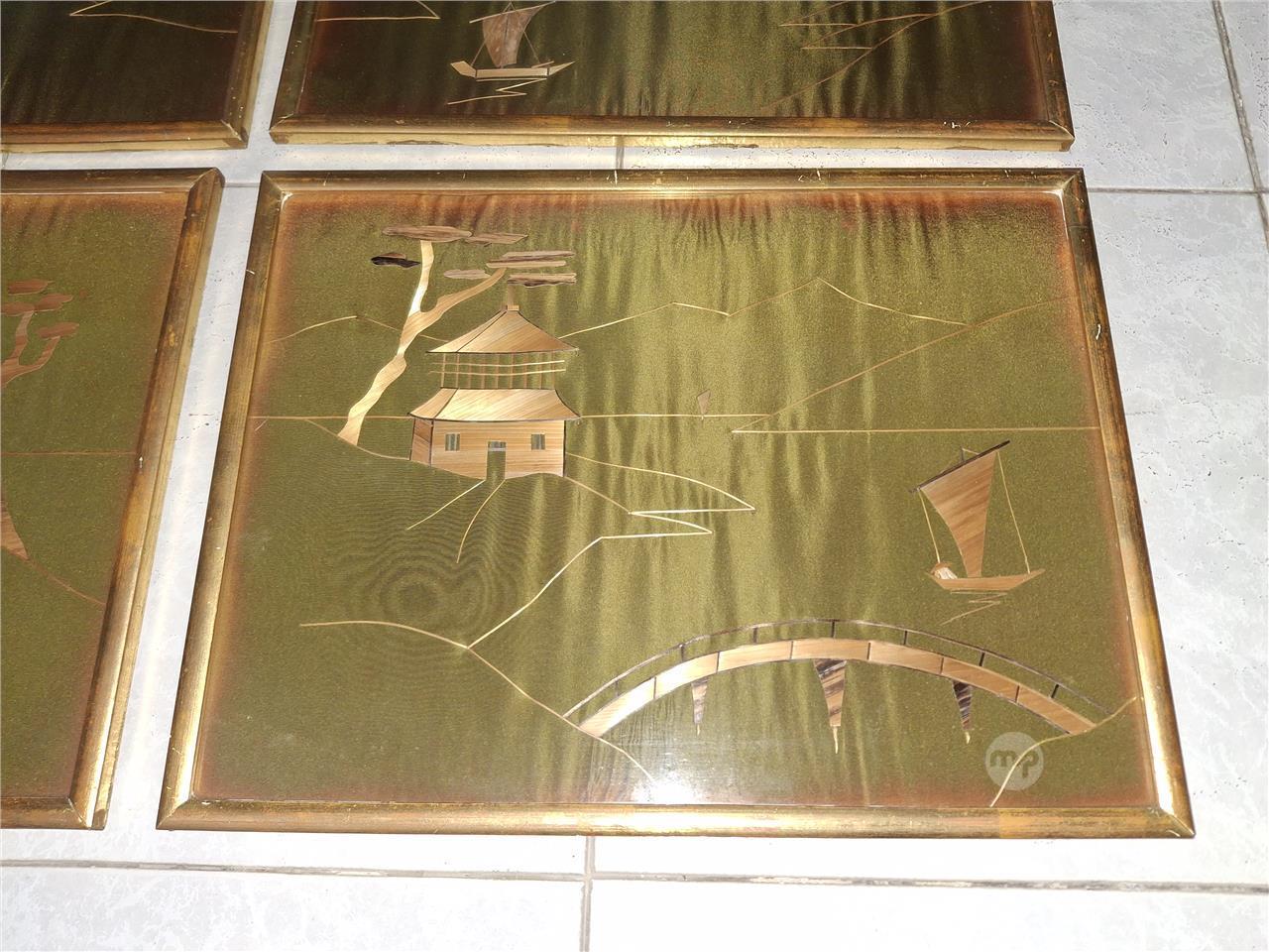 SET OF 4 GOLD FRAMED ANTIQUE PICTURES.SCE ES OF CUT BAMBOO.ON A,SILK GREEN BACKING