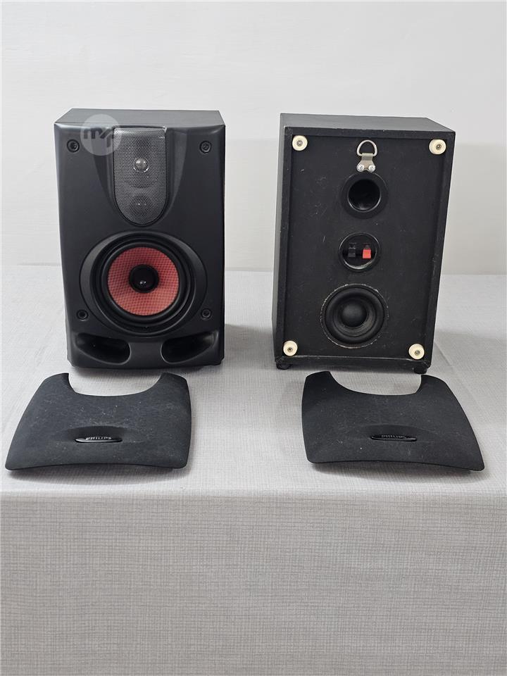 These were originally Philips book shelf speakers, due to age original speakers were replaced with new higher quality car audio 5.25’’ powerful 100 watts RMS 4 ohms speakers, and added small active small sub woofers at the rear. Bass is tight, wide midrange and good treble. Condition is good with a few scratch marks visible. These book shelf speakers are suitable for a small to medium garage or other similar working places.