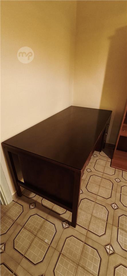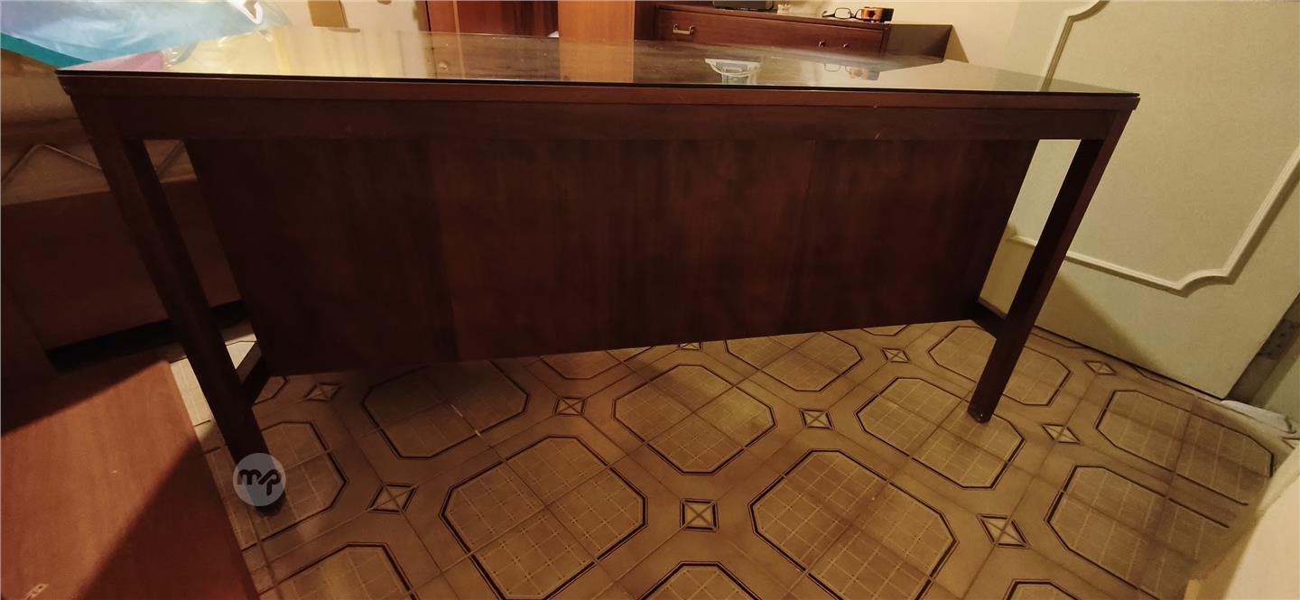 In very good condition. Solid wood desk measuring 150cm x 73cm x 73cm. Glass covered surface.
