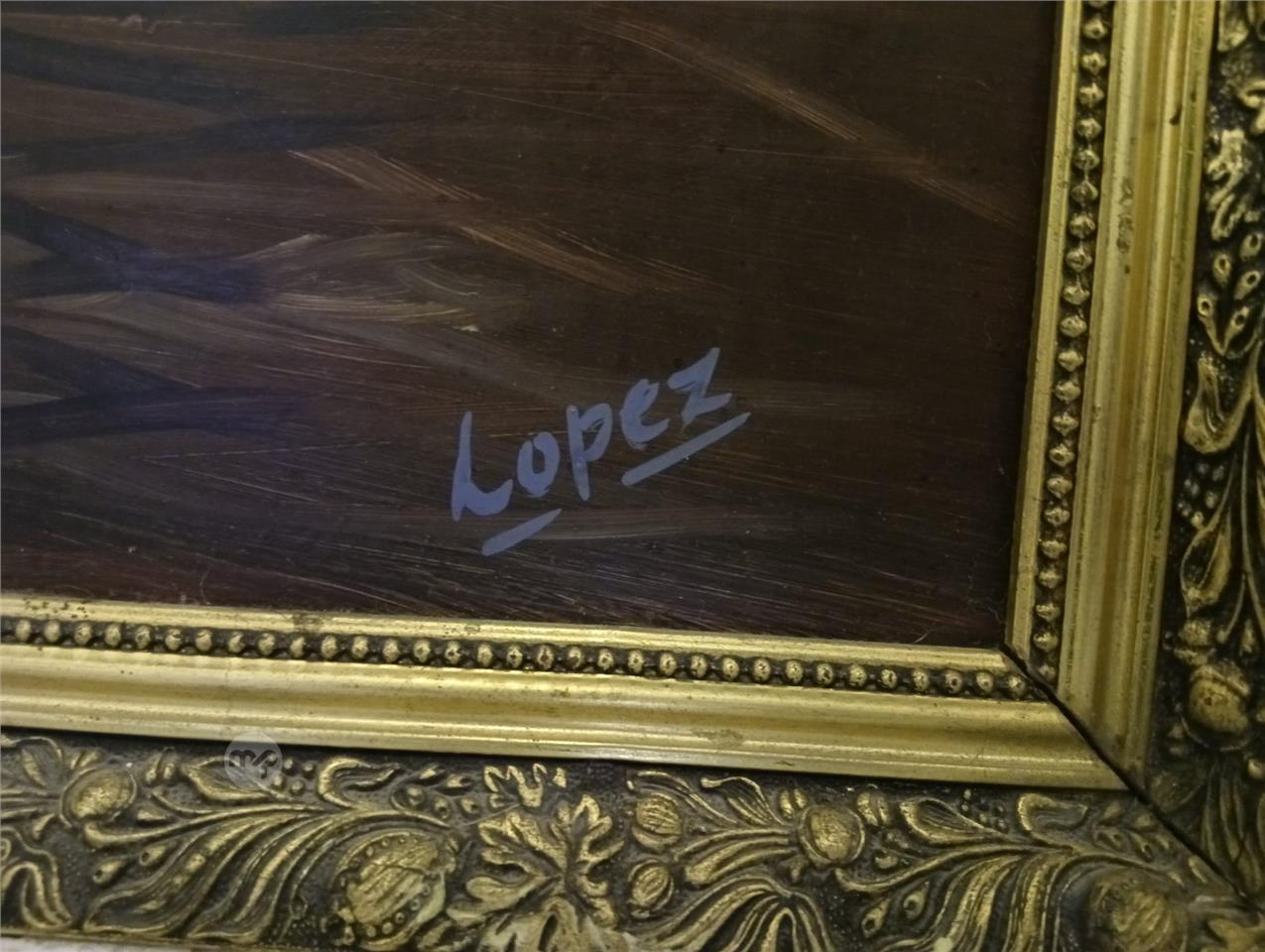 Discover this striking vintage oil painting signed "Lopez," featuring two traditional boats sailing at sunset over a dramatic red and gold sea.