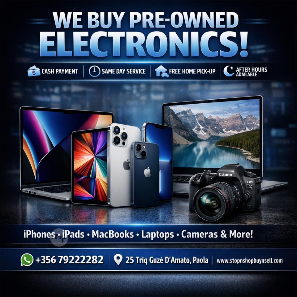 Looking to buy or sell used electronics? We deal in phones, laptops, cameras, iPads, MacBooks, PCs, and more! Whether you're upgrading your gadgets or looking for a great deal, we're here to help. Message us on WhatsApp +356 79222282 with what you're interested in buying or selling, and we’ll assist you every step of the way. Fast, reliable, and hassle-free!