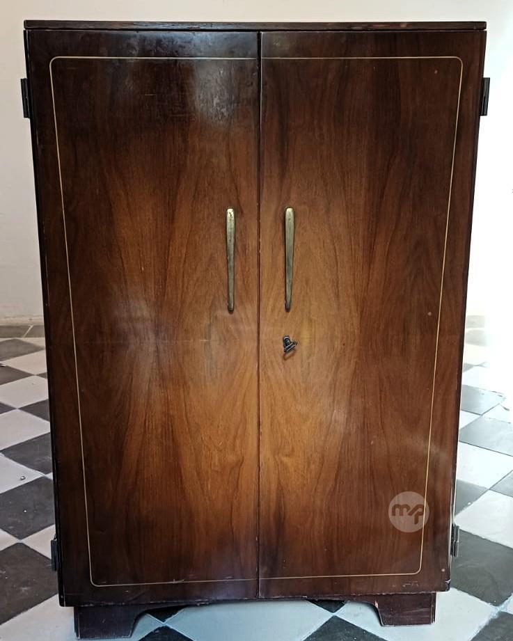 A vintage Loewe Opta "Stadion" (Type 1666) console cabinet, manufactured in West Germany during the early 1960s, measures 93 cm (H) x 60.5 cm (W) x 45 cm (D). The exterior features a rich wood veneer with gold-tone pinstripe inlays, original brass vertical pulls, and the original functional skeleton key. The unit is structurally sound and retains its original perforated, ventilated back panel. It is ideal for conversion and upcycling into a new use.