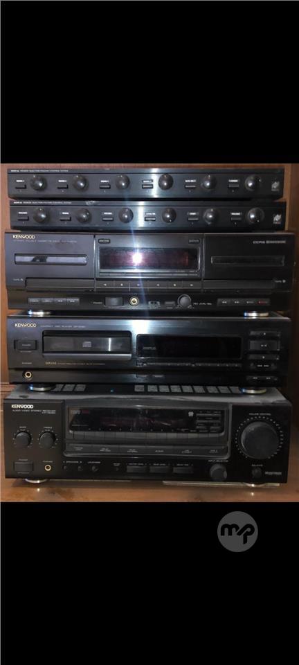 Vintage KENWOOD Audio Components (part of a Home stereo system) with graphic equaliser, double cassette deck, CD Player and an audio/video receiver.
