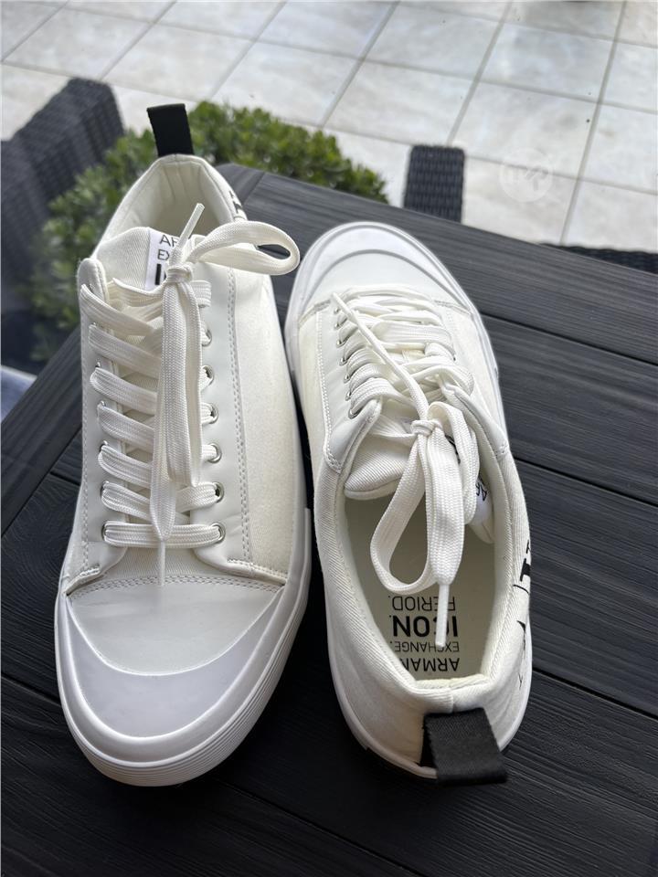 Clean, modern Armani Exchange sneakers in crisp white canvas with signature A|X logo detailing. Features lace-up closure, durable rubber sole, and a minimalist low-top design easy to dress up or down for everyday wear. Great condition, stylish and comfortable.