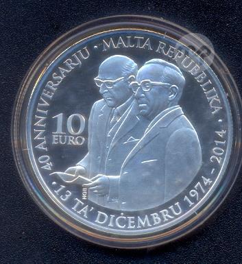 REPUBLIC OF MALTA 40th ANNIVERSARY 1974=2014 10 EURO PROOF IN BOX AND CERTIFICATE.