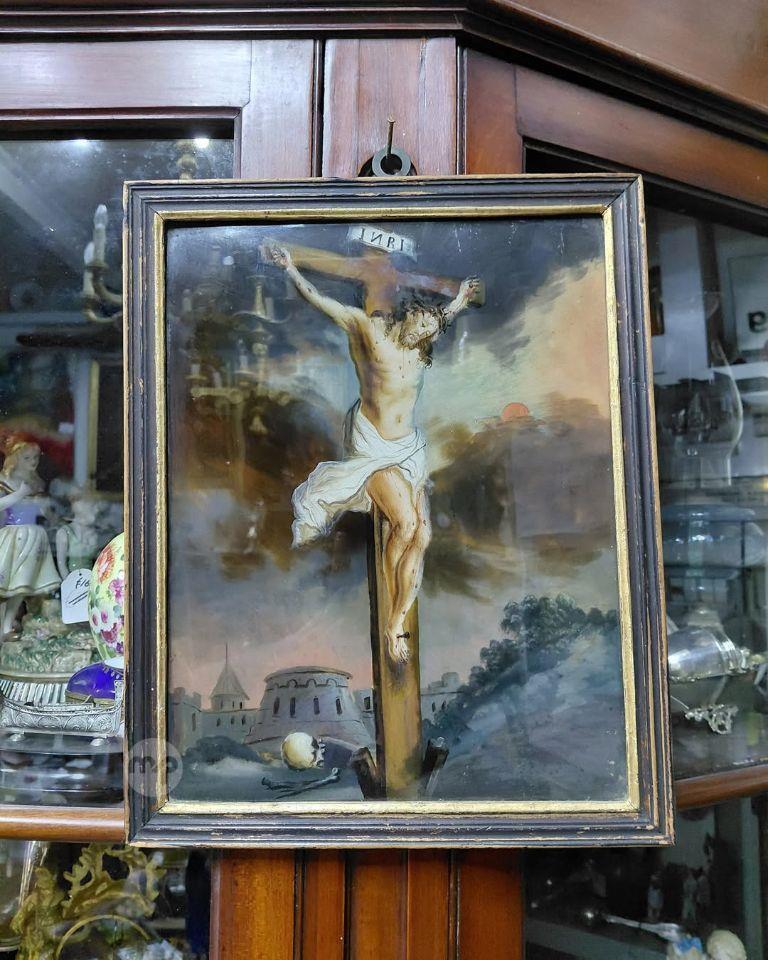 An Early 19th century reverse painting on glass Showing Christ on the Cross
