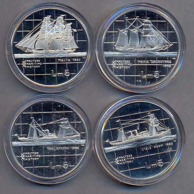 MALTA 1985 SET OF 4 SILVER COINS WITH SHIPS IN COX AND CERTIFICATE.