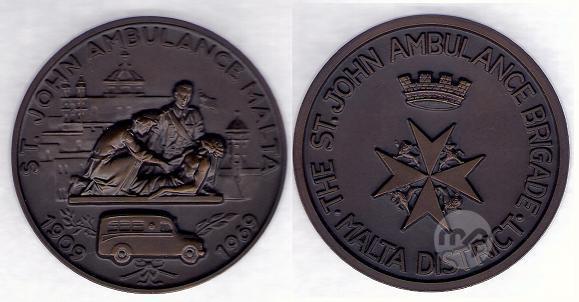 MALTA LARGE BRIGATE ST.JOHN AMBULANCE 1909-1969 BRONZE MEDAL IN BOX AND CERTIFICATE.