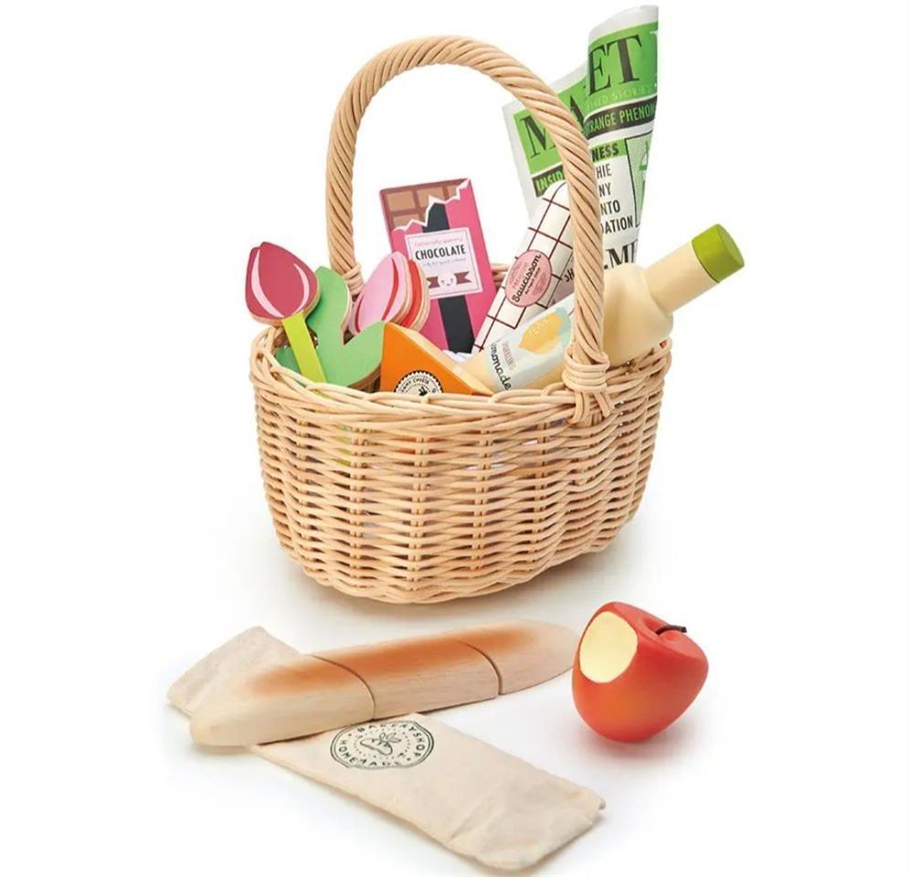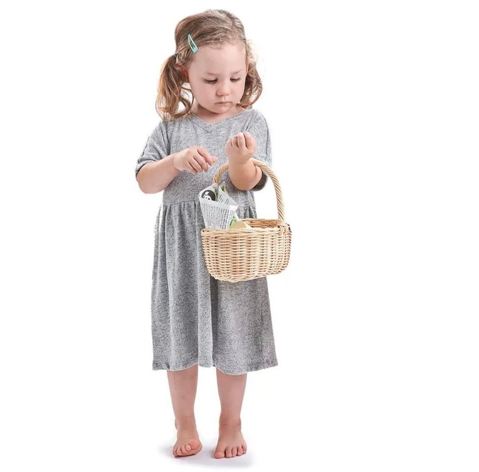 Tender Leaf Toys - Wicker Shopping Basket - Handcrafted Wicker Basket with Handle - Wooden Picnic Basket Playset, Supermarket Shopping Game, Pretend Play Food Set - Age 3+