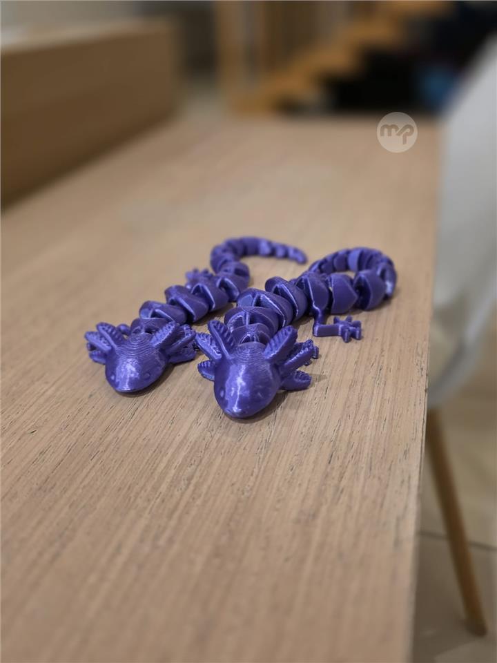 Fun and unique 3D printed flexible lizards in a vibrant purple color. The body is articulated, so it moves and bends easily, making them great as a toy, desk decoration, or stress fidget.