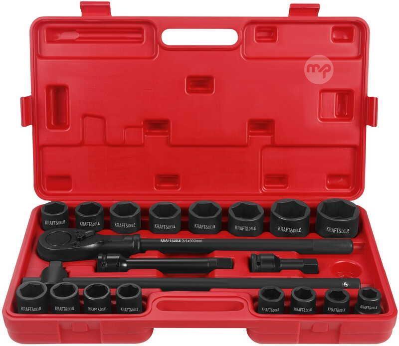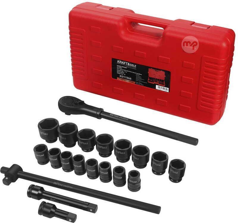 The KD11868 is a professional impact socket set from KRAFT&DELE, designed for heavy-duty workshop and industrial use. With a 3/4" drive and a wide range of sizes, the set is ideal for handling large screws, nuts, and fasteners requiring high torque. The sockets are made of durable chrome-molybdenum (Cr-Mo) steel, ensuring resistance to heavy loads and long life in everyday use.