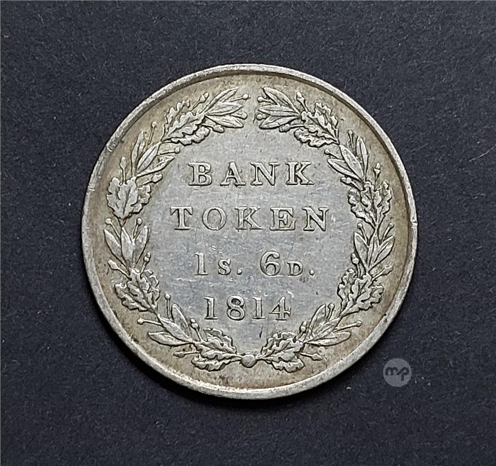 1814 Great Britain, Bank of England Eighteen Pence (1 Shilling 6 Pence) King George III Token, 0.925 Sterling Silver.